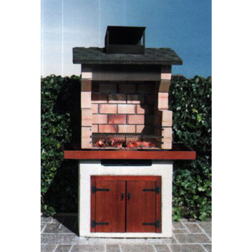 Барбекю из конгломерата белого цвета, плита из греса, дверцы из обработанного дерева. Топка из огнеупорного кирпича с решеткой, зольник и решетка для жарки с направляющими. Верх барбекю черного цвета - иммитация слнца Pizarra. Металлические козырек и короб.