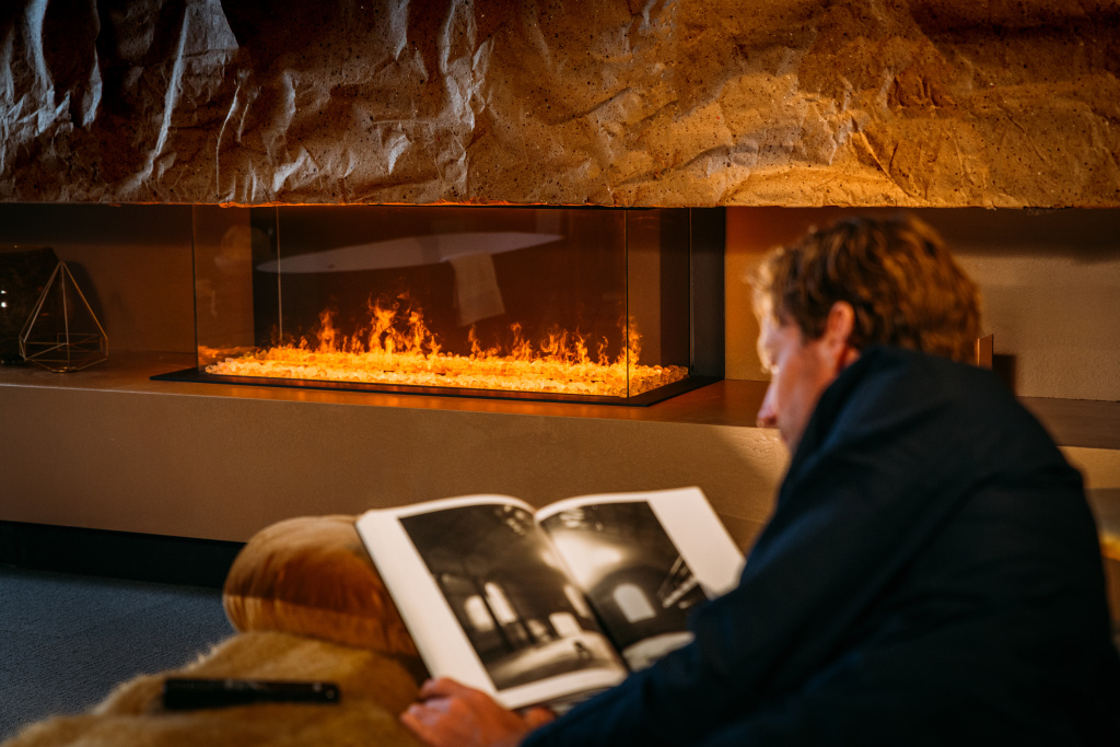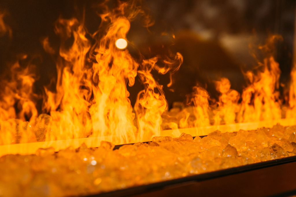 Чтобы стенки камина не запотевали, мощные вентиляторы непрерывно втягивают водяной пар. Из-за движения пара пламенные языки подрагивают как настоящие, что также увеличивает реалистичность камина.