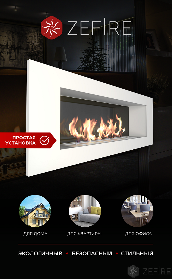 Zefire Elliot 1200 белый со стемалитом – лаконичная и стильная модель встраиваемого настенного биокамина, которая будет одинаково удачно смотреться в современном и классическом интерьере. Такой биокамин не занимает в помещении лишнего пространства, потому подойдет даже для небольших площадей. Его монтаж не требует устройства дымохода или вытяжки и может выполняться без специальных разрешений.