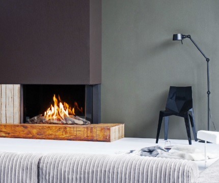 Современный угловой газовый камин Faber Matrix 1050/650 II с широким видовым стеклом без рамки новым поколением объемной горелки Log burner. Декоративное оформление топки комплектом дров и хвороста. Закрытая топка. Требуется подключение к коаксиальному (труба в трубе) дымоходу.