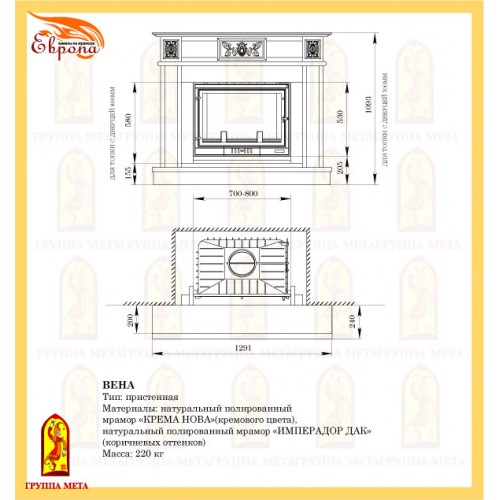 Каминная облицовка ВЕНА изготовлена из натурального полированного мрамора. Основная часть конструкции кремового цвета "Крема Нова" украшена вставками «Имперадор Дак» коричневых оттенков. Верхняя часть камина выполнена в виде полки.