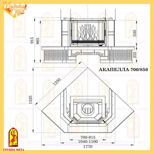 Технические характеристики: Тип: Угловая Материал: Камень META Stone™ (серо-белого цвета) Габаритные размеры: 1770(ш)х1250(к)х915(в) мм Macca: *300 кг Подходит для топок: Призма 700, Призма 700П, Призма 850П