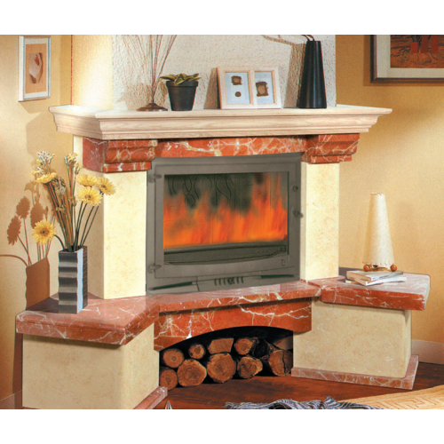 Оригинальный и способный гармонично дополнить даже самый изысканный интерьер, камин Bella Italia Florencja доступен в двух вариациях – пристенном и угловом исполнении. Облицовка имеет идеальное сочетание доступной цены и первоклассных эстетических свойств. Здесь удачно скомбинирован патинированный мрамор Sunny Light Yellow с полированным мрамором Rojo Allicante, изящные прожилки которого разбавляются разноцветными вкраплениями, различными по форме. Завершает общую композицию элегантная балка из светлого дуба.