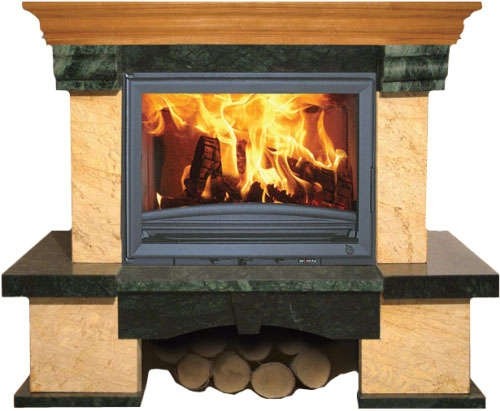 Сама облицовка и декоративные элементы выполнены из полированного мрамора Сильвия Елло и Верде Гватемала. Декоративная деревянная балка служит небольшой полочкой. Предусмотренно место для хранения дров.