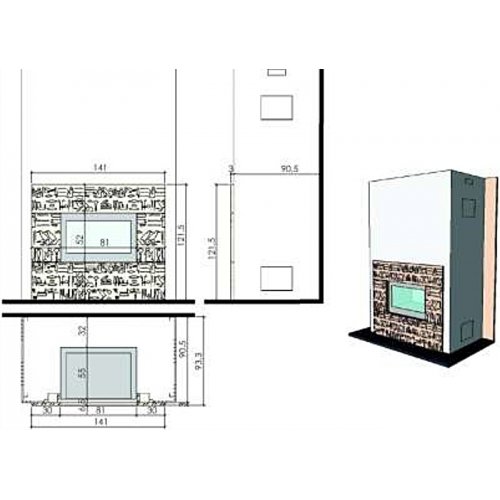 Полувстроенный камин, обрамление выполнено из камня Martigny с нанесением иероглифов. Прямой фасада, топка с большим огнепрочным стеклом. Увеличенный обзор огня.