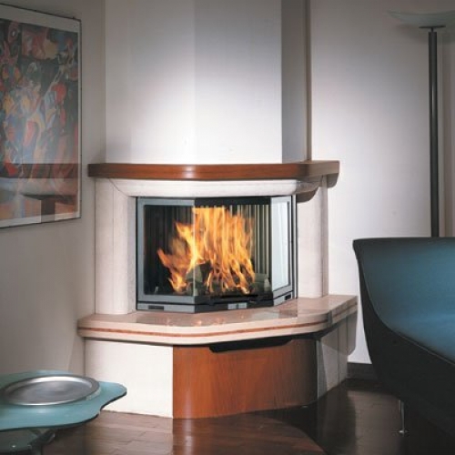 Угловой камин с боковинами и цоколем из бучардированного мрамора Trani, верхней балкой и дверцей в цоколе из дерева.