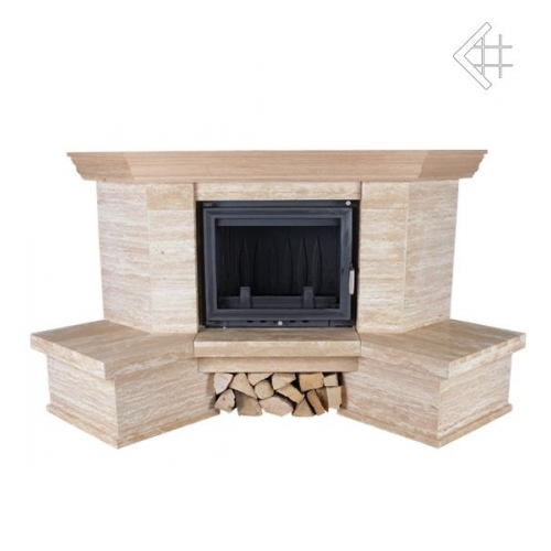 Представлена бюджетная каминная облицовка в угловом исполнении. Каминная облицовка выполнена из натурального полированного и состаренного травертина с дубовой балкой. В связи с тенденцией к использованию каждого сантиметра имеющейся площади, владельцы загородных домов ищут способы активно использовать каждый квадрат жилого пространства. Опыт показывает, что угол в доме чаще всего остается не задействованным, поэтому именно в нем целесообразно разместить камин. Таким образом можно убить сразу двух зайцев: установить угловой камин в своем доме, сэкономив площадь жилища, и отлично украсить интерьер помещения, ведь из угла огонь видно практически из любого места в комнате.