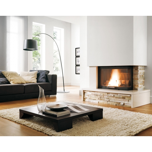 Камин Palazzetti New Castle выполнена из Yellow Quartzite или белого камня. Столешница и панели из белого мрамора Limestone. Балка из белёной сосны.