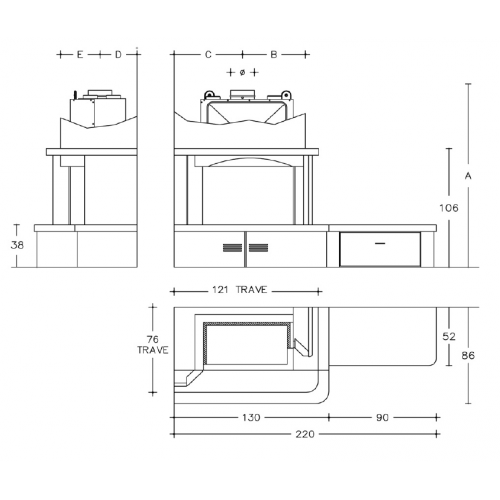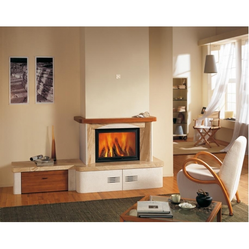 Встраиваемый камин прямоугольной формы, изготовленный из мрамора двух цветов. В нижней части камина предусмотрены отверстия для доступа воздуха. Над камином расположен регулятор подачи воздуха. Камин декорирован деревянной балкой. В качестве горючего применяются дрова. Параметры: Длина: 130 см Высота: 106 см Глубина: 86 см