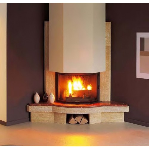 Угловой камин. Изготовлен из камня Castillon + красный "rocmarble" Corallin. Кожух 245080.
