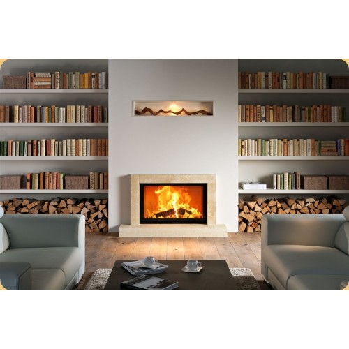 Каминная топка с прямым стеклом. Топочная камера футерована шамотом. Подъёмный механизм двери (система Easy-Lift). Ширина дверки 850 мм. Высота дверки 484 мм. Возможно подключение воздуха из-вне. В комплекте поставляется декоративная или монтажная рамка.