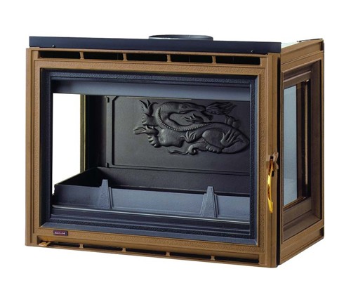 Чугунная топка для каминной облицовки. Прямая дверца с бронзовой рамкой. Огнепрочное трехстороннее стекло, выдерживающее высокую температуру. Дверца открывается в сторону. Система очистки стекла.