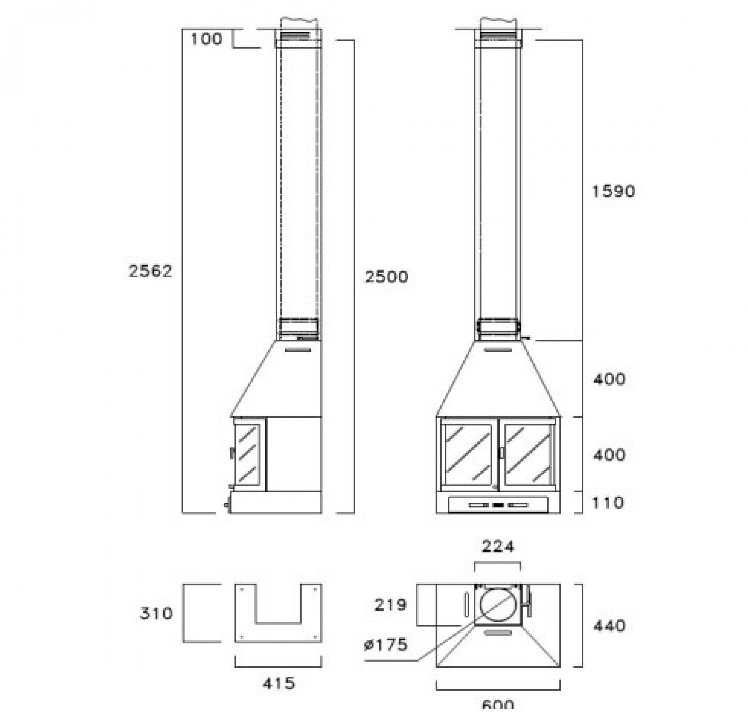 Фронтальный (пристенный) металлический камин. Дрова: 35 см.