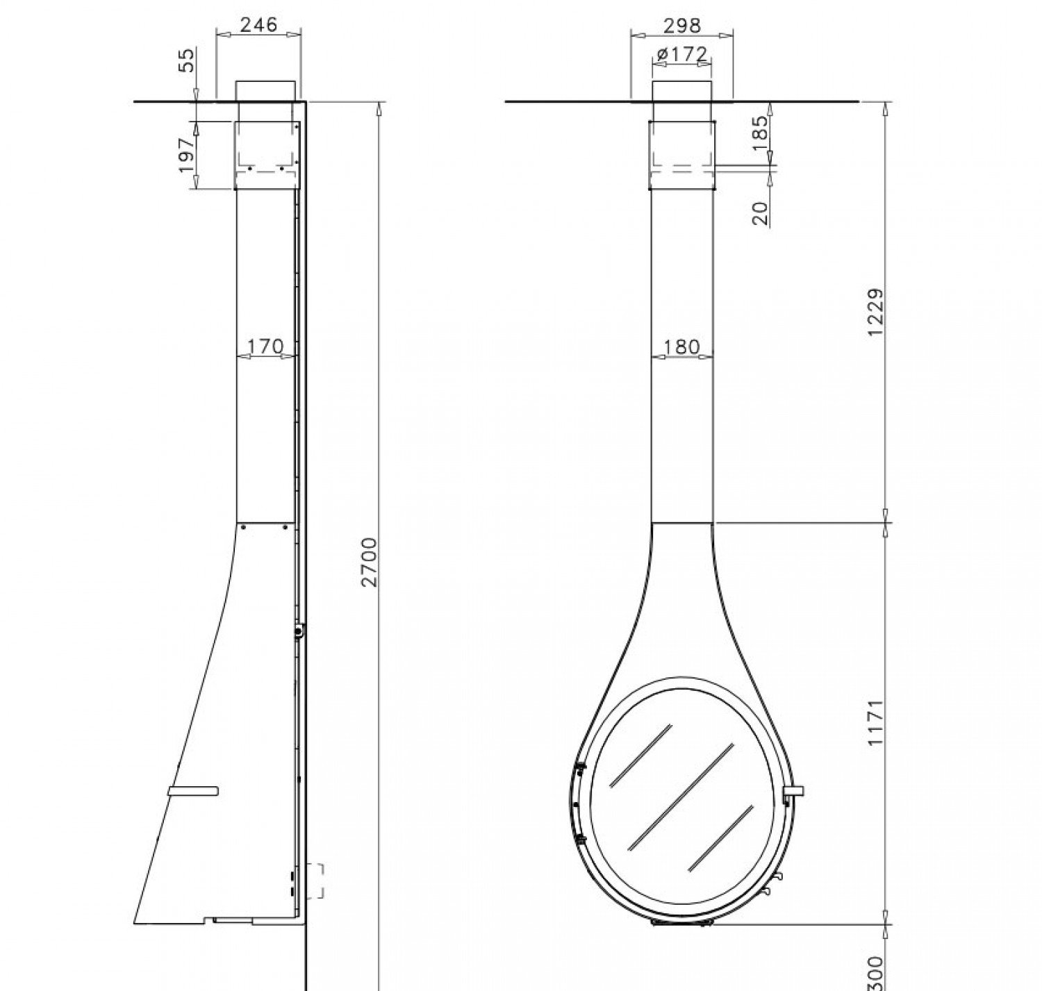 Фронтальный (пристенный) металлический камин. Дрова: 30 см.