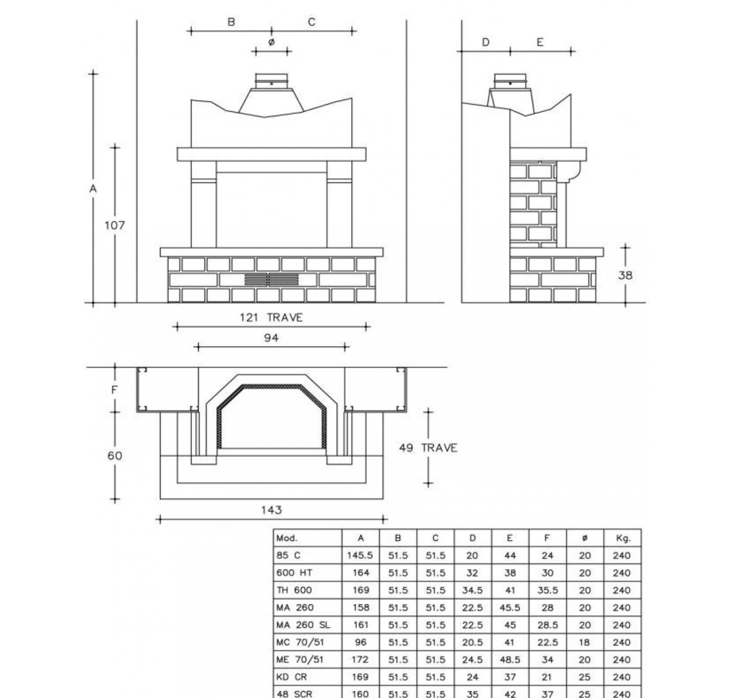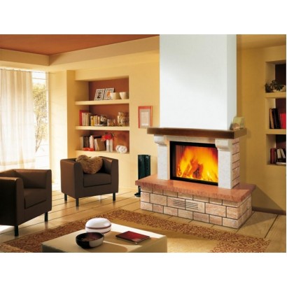 Облицовка из состаренного травертина, имитирующего кирпичную кладку. Очаг из полированного мрамора Rosso Asiago, полка и модильон из гладкого камня Giallo dIstria. Балка из древесины ели.  На фото представлена модель с дровяной топкой HT 600 Техническая информация