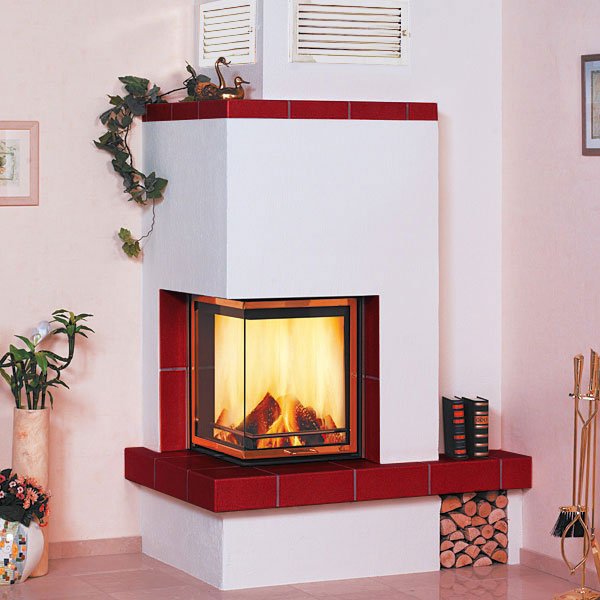 Пристенно-угловой камин из изразцов цвета bordeaux-rot, с белыми решетками (2 шт).