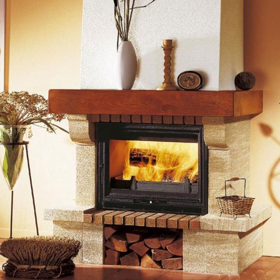 Пристенный камин из камня Castillon. Балка из экзотического дерева. На снимке представлен камин с топкой Tertio 67.