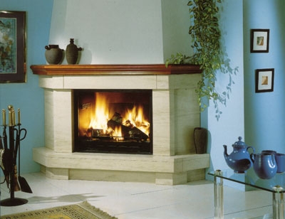 Угловой камин серии Stylo из полированного мрамора Crema Moka. Формированная деревянная балка. Металлическая топка 904, колосник и зольник.