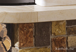 Выполнен из белого бучардированного камня со столешницей и аркой из кирпича. Балка из соснового массива под орех.