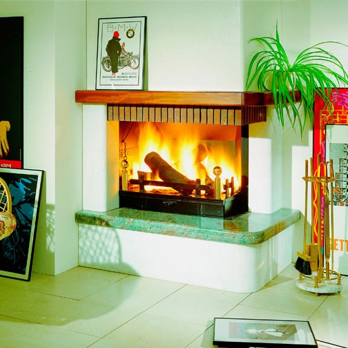 Угловой камин из бучардированного мрамора Becco. Плита из полированного гранита Frondo. Консоль из огнеупорного кирпича толщиной 3 см. Металлическая топка 071, открытая сбоку, зольник и колосник.
