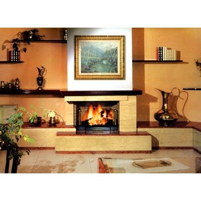 Фронтальный камин из полированного мрамора Crema Benedetta. Плита и цоколь из красного полированного мрамора Rosso Forte. Балка из формированного дерева. Металлическая топка из огнеупорного кирпича, открытая сбоку.