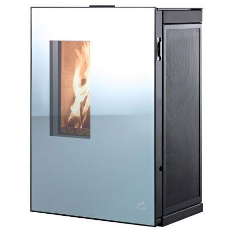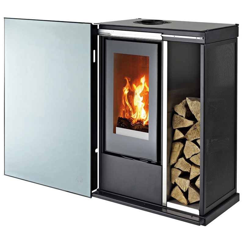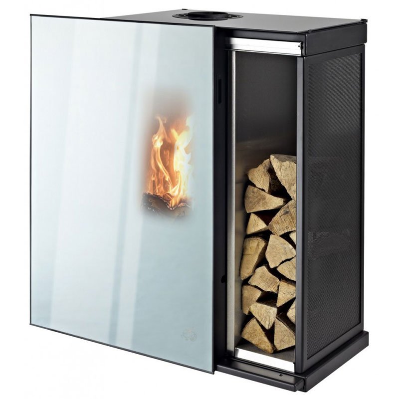 Главный дизайнерский и конструкторский акцент сделан на раздвижную зеркальную дверь. Дверца печи полностью сливается с прямоугольной конфигурацией изделия, составляет с ней единое целое. На первый взгляд даже сложно понять, где у печи находится дверь и топка. Но с помощью специального механизма зеркальная дверь плавно отъезжает в сторону, открывая и топку, и даже небольшой дровник для хранения топлива. В процессе отопления, огонь проступает сквозь зеркальную поверхность и демонстрирует зрителю свою мощь и красоту. По вашему желанию, раздвижную дверь можно закрыть полностью, а можно только наполовину.