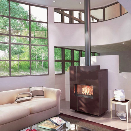 Металлическая отопительная печь-камин. Ввод наружнего/первичного воздуха. Облицовка для топки из нержавеющей стали. Вертикальная полоска-инкрустация из нержавеющей стали. Поднимающаяся и открывающаяся классическим способом дверца. Цвет RAL 8017.