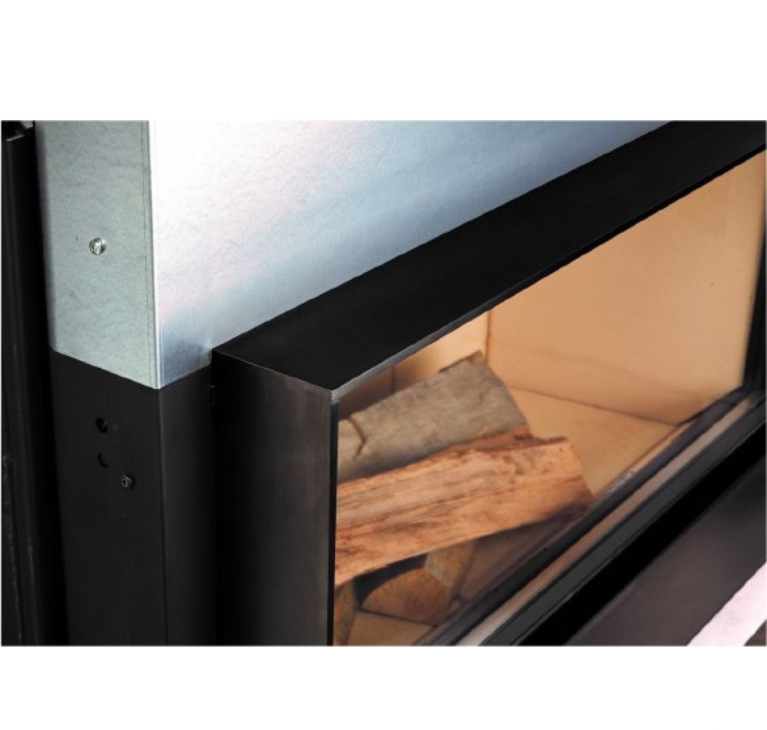 Угловая каминная топка с Г-образным стеклом. Боковое стекло слева. Топочная камера футерована шамотом. Подъёмный механизм двери (система Easy-Lift). Ширина дверки 338+338 мм. Высота дверки 702 мм. Возможно подключение воздуха извне.