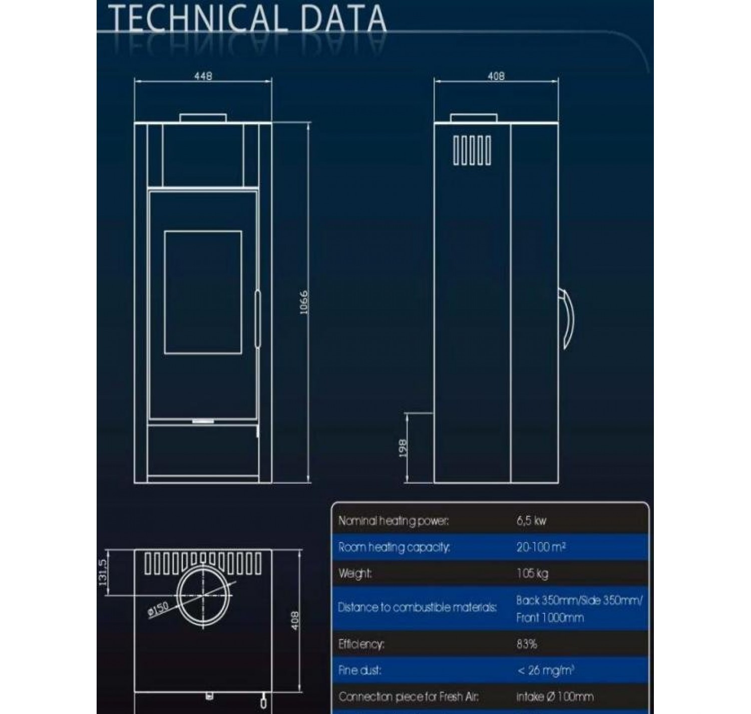 - Диаметр дымохода, (мм) 150 мм.