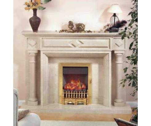 Этот элегантный портал выполнен из высококачественного мрамора цвета «кофе с молоком». Классические колонны по бокам и золоченое обрамление очага придают этому камину роскошный вид, а орнамент в виде ромбов - оригинальность.