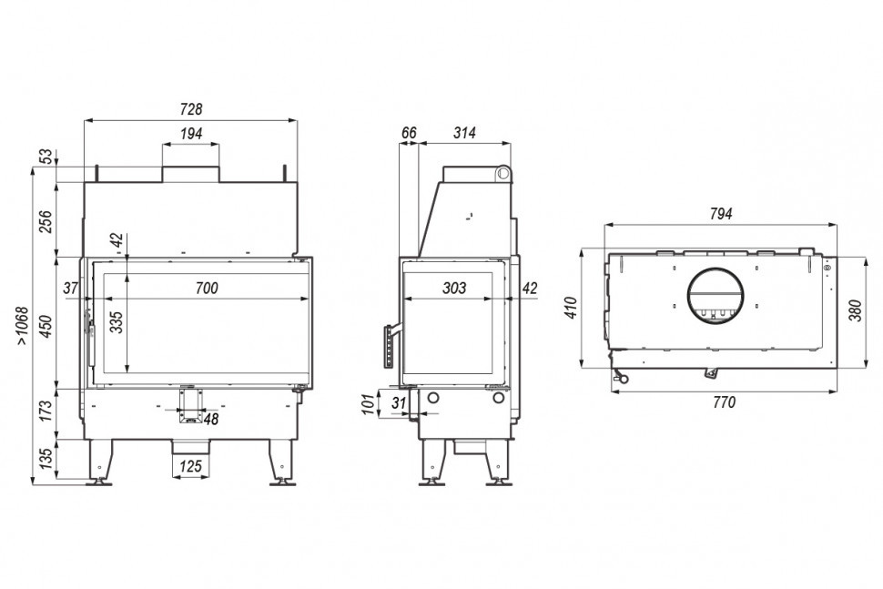 Топка оборудована закаленным стеклом, стойким к высоким температурам (до 800 °С). Вставка изготовлена из высококачественной стали, имеет энергоэффективность ― класс A и отапливает помещения площадью 45-145 м². Модель дополняется стальной декоративной рамкой, которая приобретается отдельно.