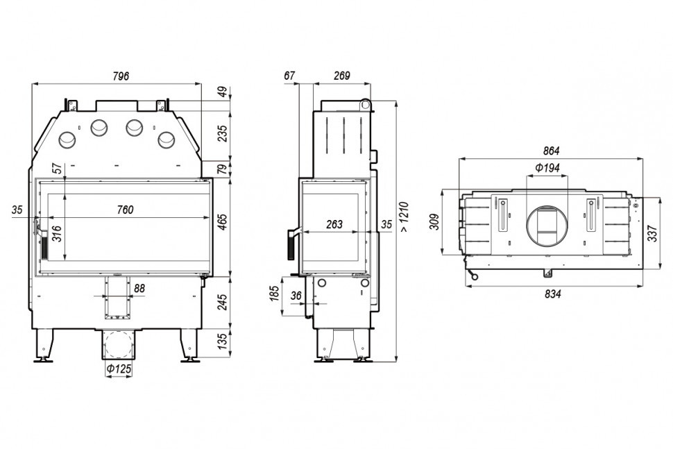 Для обеспечения более длительной эксплуатации и оптимизации мощности каминной вставки можно докупить боковые, задние или комплект тэрмоблоков. Также топка дополняется стальной декоративной рамкой, которая приобретается отдельно. Дополнительная опция: дверная ручка черного цвета.