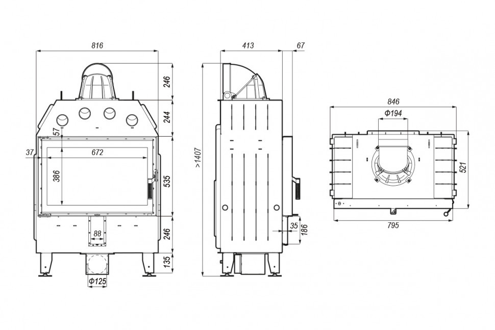 Изготовлена из стали с порошковым покрытием и имеет эффективность нагрева 80 %. Устройство с центральной подачей воздуха снаружи и возможностью ее регулировки. Специальная конструкция на трубе для подачи воздуха в топку, дает возможность изменить направление подачи воздуха на боковое. Плотно размещенные радиаторы способствуют передачи больше тепла окружающей среде, а воздуховоды повышают эффективность камина. Модель оборудована жаростойким стеклом, что выдерживает температуру до 800 °С.