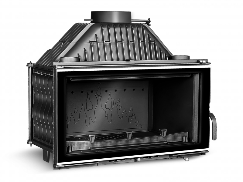 Для защиты корпуса каминной топки в конструкции топочной камеры также установлена двойная задняя стенка с красивым и объёмным рисунком, которая обеспечивает долговечность каминных топок KAWMET.