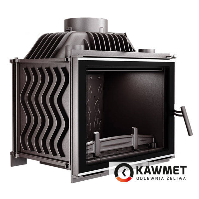 Повышенный КПД и теплоотдачу обеспечивает чугунный дефлектор, который расположен над камерой сгорания каминной топки KAWMET. Назначение дефлектора - направить недогоревшие частицы дровяного газа в центральную часть камеры сгорания, где происходит повторное догорание. Также дефлектор увеличивает тепловую эффективность топки путем удлинения пути прохождения продуктов сгорания.