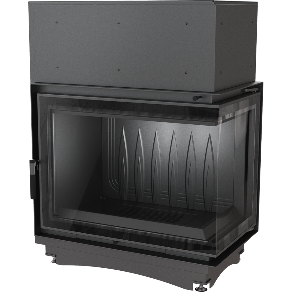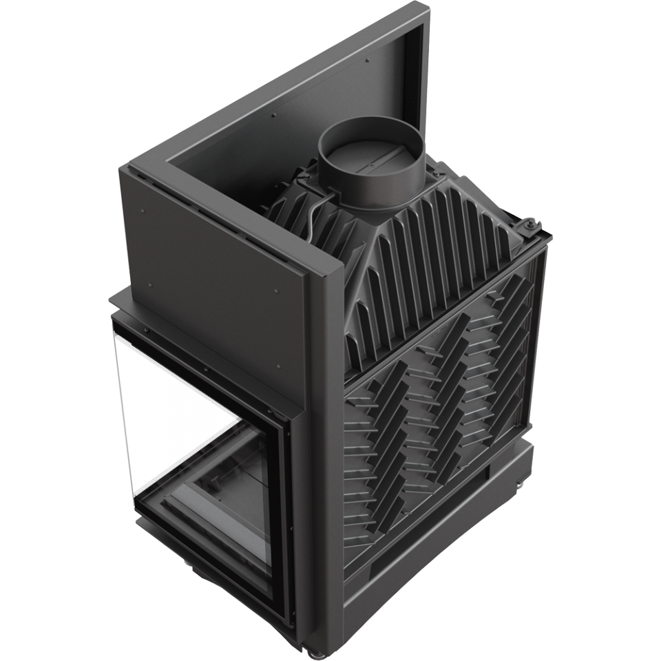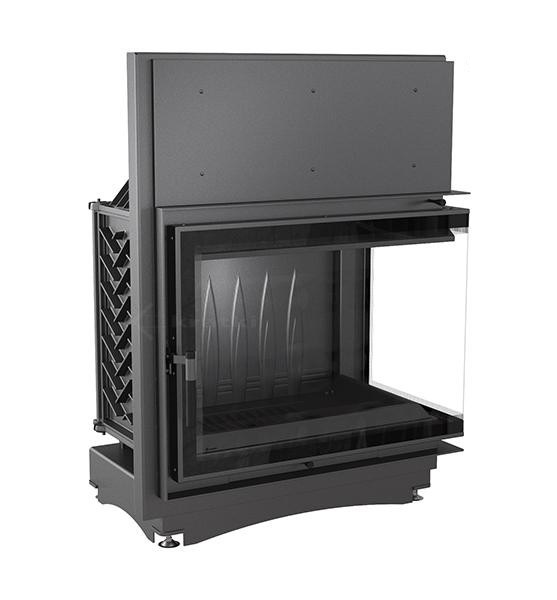 • Угловая топка с цельным Г-образным стеклом. Дверца топки распашная.