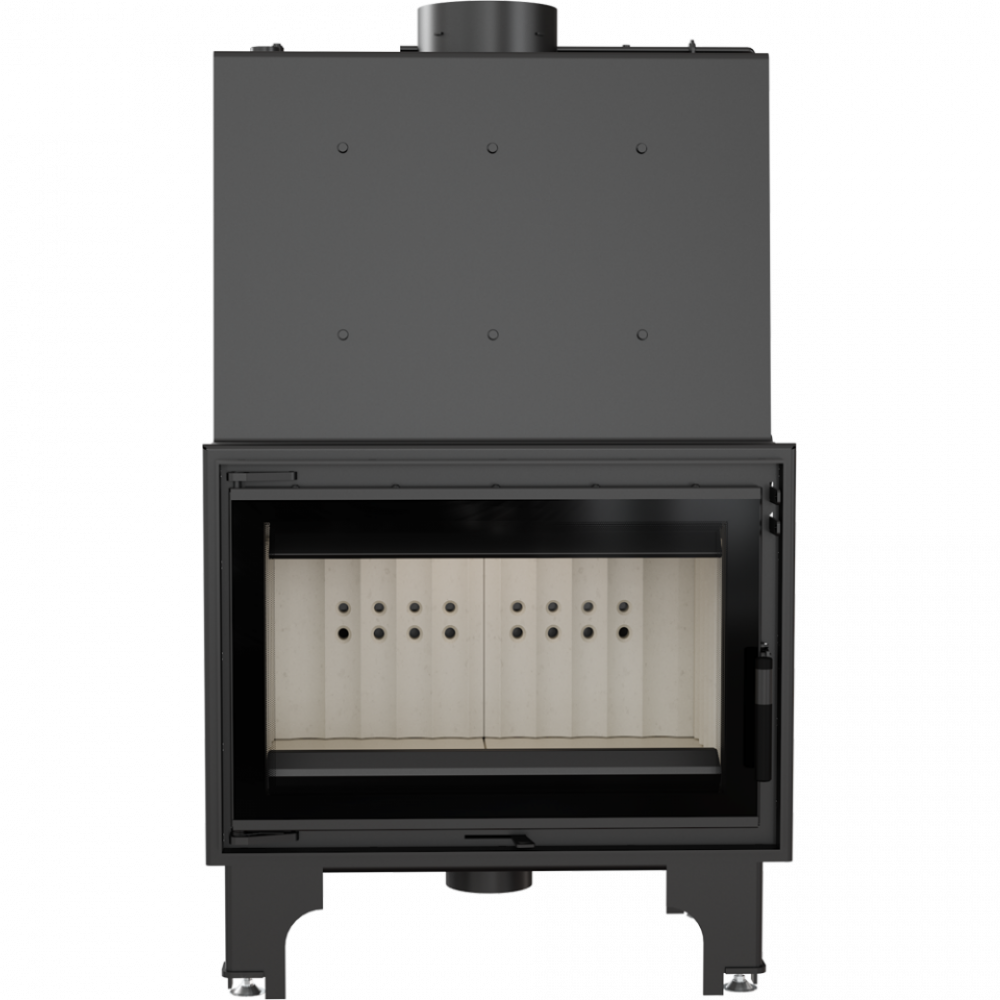 - Система аэрации камеры сгорания, реализована исключительно извне через доставку первичного и вторичного воздуха в камеру сгорания. Стандартно топка имеет подвод воздуха диаметром ø 125 мм, который дает возможность подать свежий воздух в камеру сгорания снаружи здания. Разделение воздуха проходит в пространстве ниже нижней плиты камеры сгорания. Воздух поступает каналом, который находится на высоте нижней плиты к забору, оборудованному вдоль всей длины системой отверстий. Это приводит к улучшениям условий сгорания шихты. Сгорание происходит равномерно по всей ширине камеры сгорания. Регулировка интенсивности сгорания в топке происходит с помощью механизма, который находится ниже дверец топки.