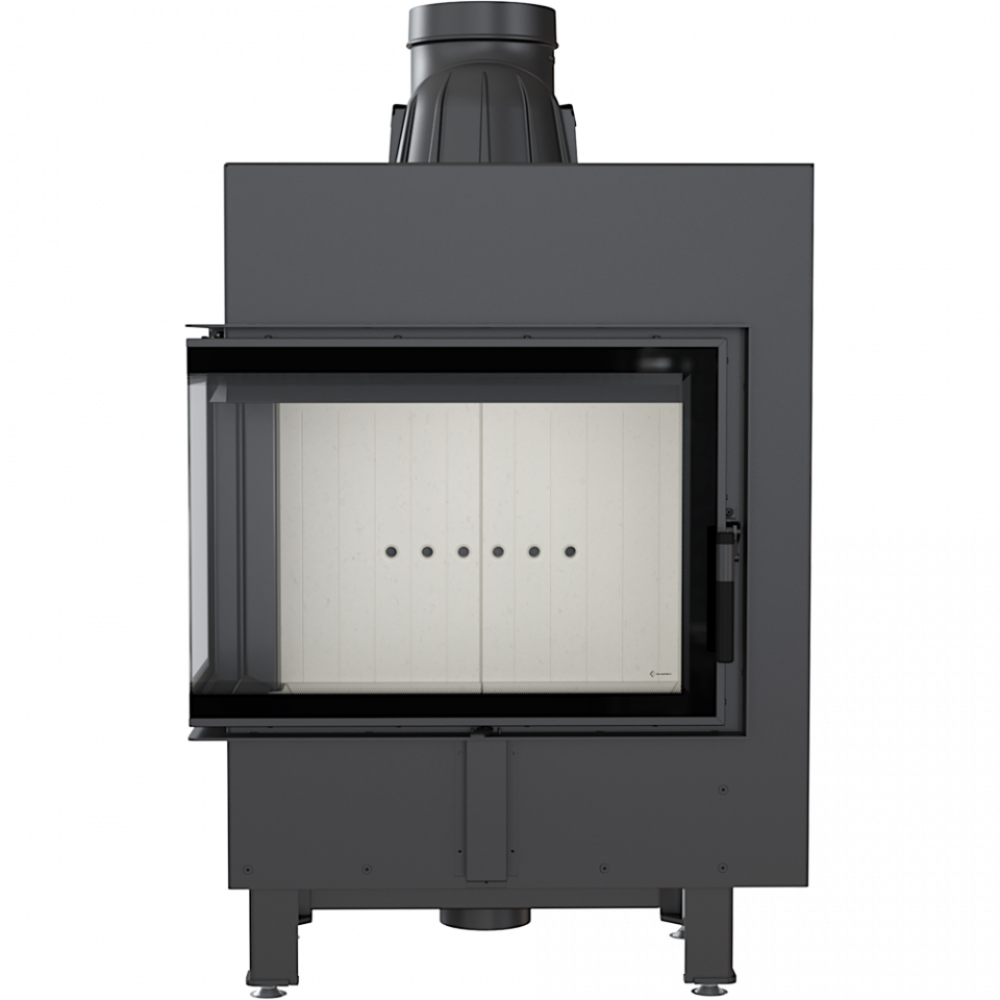 - Модель оснащена подвижным дымоходным отверстием, так что во время монтажа нет необходимости покупать дополнительные колена. Можно легко подобрать угол подключения топки к каминной инсталляции.