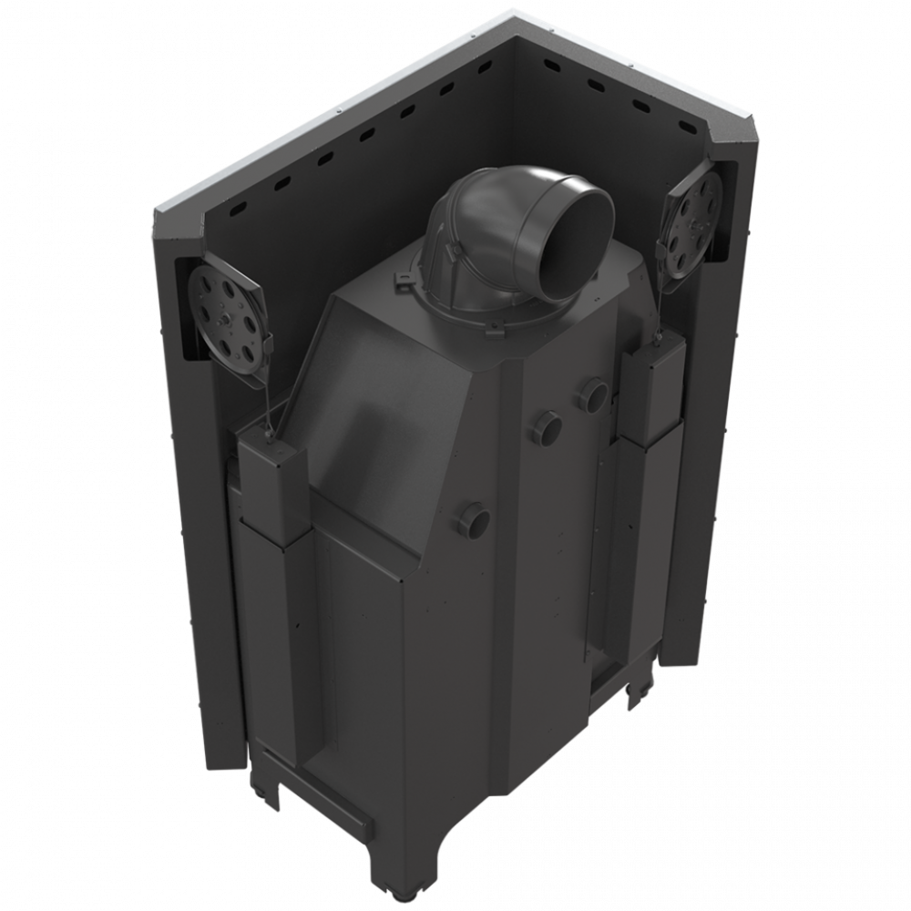 - Дверцы топки работают в системе lift up - стеклянная панель поднимается вверх. Эта система была построена, опираясь в противовес - два блока (по обоим сторонам двери) со стальной рейкой работают в направляющих на двух несущих роликах, благодаря чему вес двери равномерно распределяется. Они движутся вдоль на огнеупорных роликах, установленных в дверной раме, что гарантирует их лёгкое, тихое и бесперебойное функционирование. Движение дверец происходит на расстоянии пару миллиметров от корпуса, что предотвращает повреждение герметизации. Дверцы, которые закрываются, с большой силой погружаются в дверную раму, благодаря чему камера сгорания есть полностью герметичной.