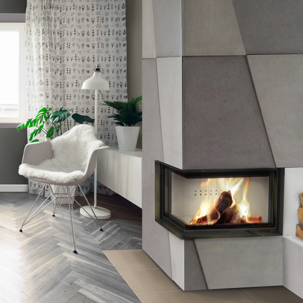 - Каминная топка с двумя стеклянными панелями, сопоставленными друг напротив друга под прямым углом (стеклянные панели соединены без рамы).