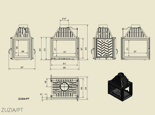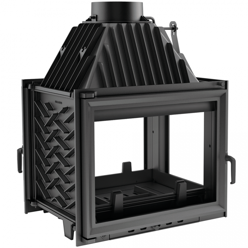 Zuzia/PT (туннель, стекло справа) – популярная серия встраиваемых каминных топок польского производителя Kratki. Представленная модель – модификация стандартной модели Zuzia, которая имеет трехстороннее остекление. Такой вариант исполнения не только позволяет устанавливать топку в центре жилого помещения, но и предоставляет 3-х сторонний обзор. К тому же данная топка имеет две дверцы – закладывать дрова можно с любой удобной стороны.