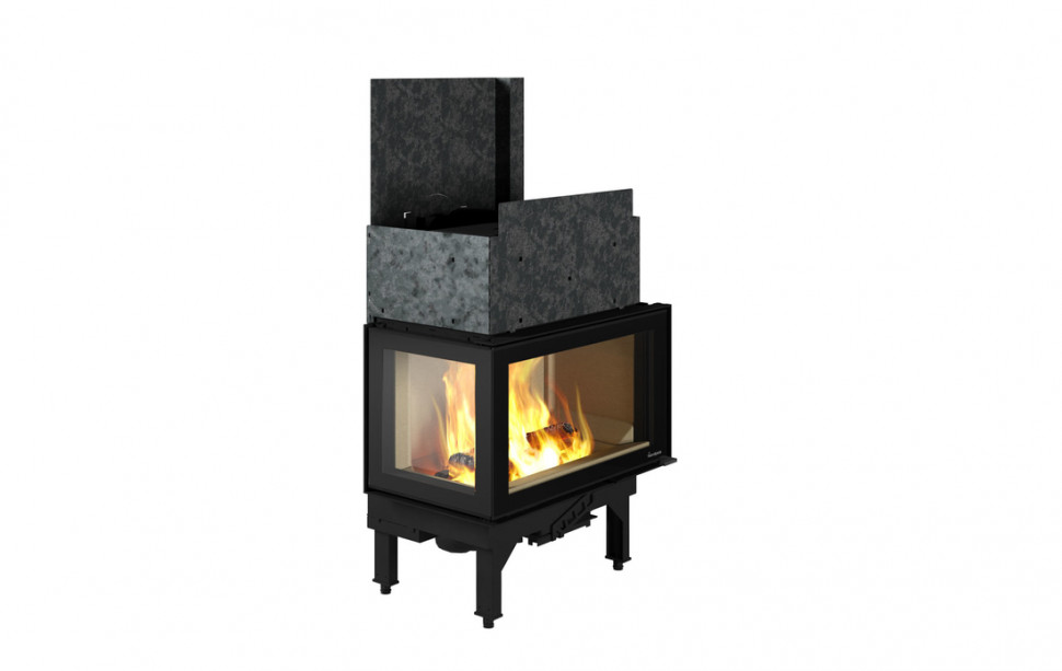 Прекрасно подойдет для обустройства камина в гостиной комнате. Боковая стенка и дверца имеют двойные стекла, с нанесением теплоотражающего покрытия, которое направляет тепловую энергию внутрь топки, что позволяет стеклу оставаться чистым, а процесс сгорания дров становится более эффективным. Футеровка топки выполнена из специальной жаростойкой керамики Аккумотт. Для большей теплоотдачи, можно дополнительно приобрести теплоаккумулирующий комплект.