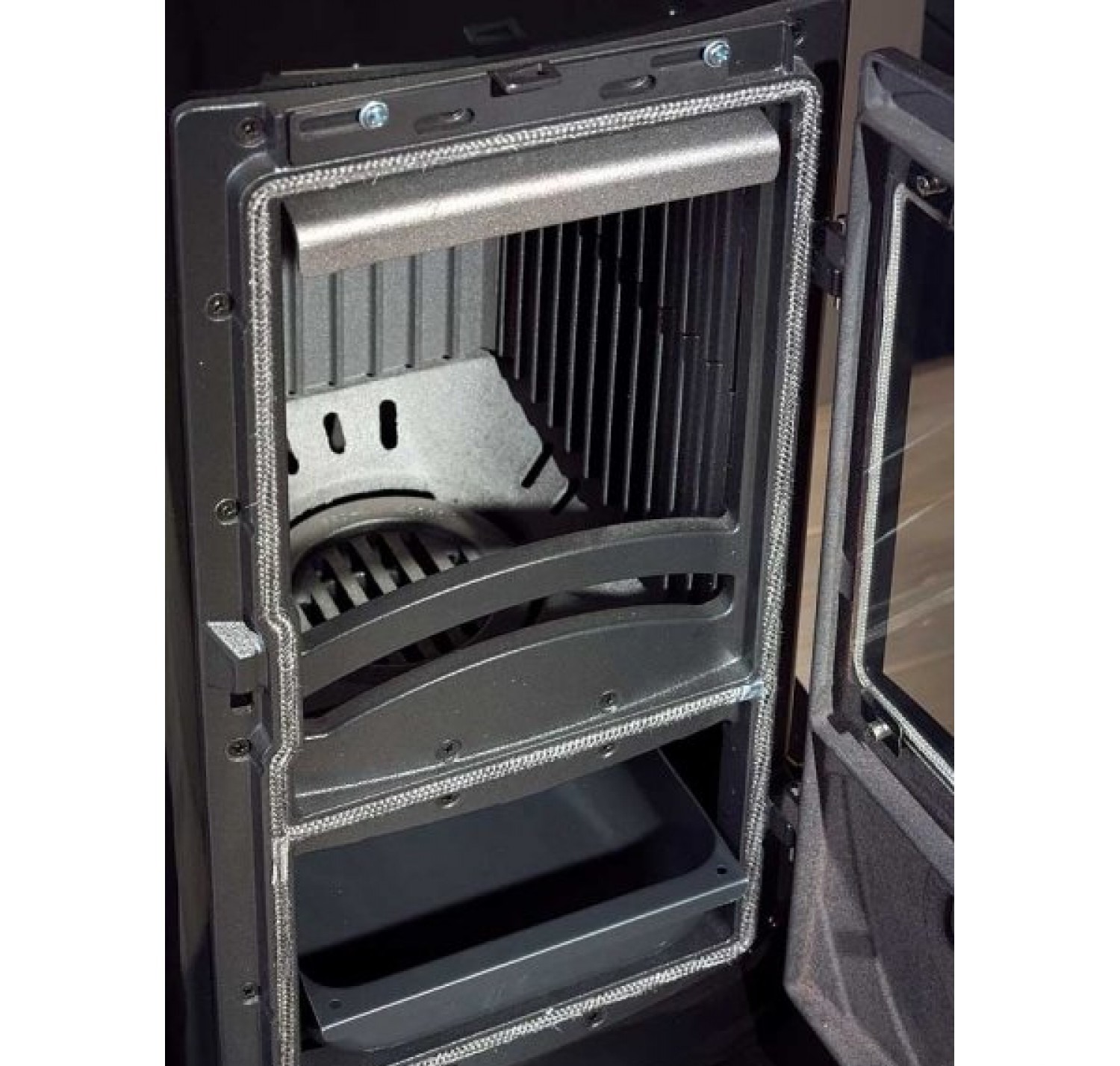- Панорамная дверь, которая позволяет легко загружать топливо и наслаждаться игрой живого пламени.