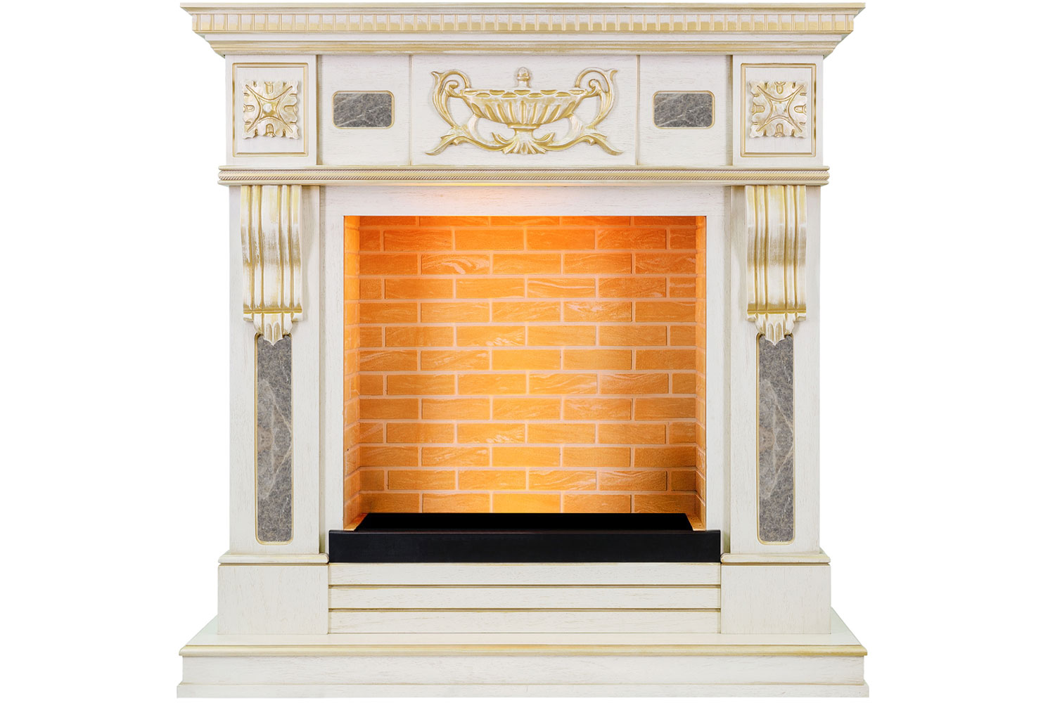 Боковые части портала и фронтон каминокомплекта Dimplex Corsica украшены изящным золотым орнаментом. По центру фронтона расположена лепнина в виде античной амфоры. Кронштейны украшены декоративным узором.