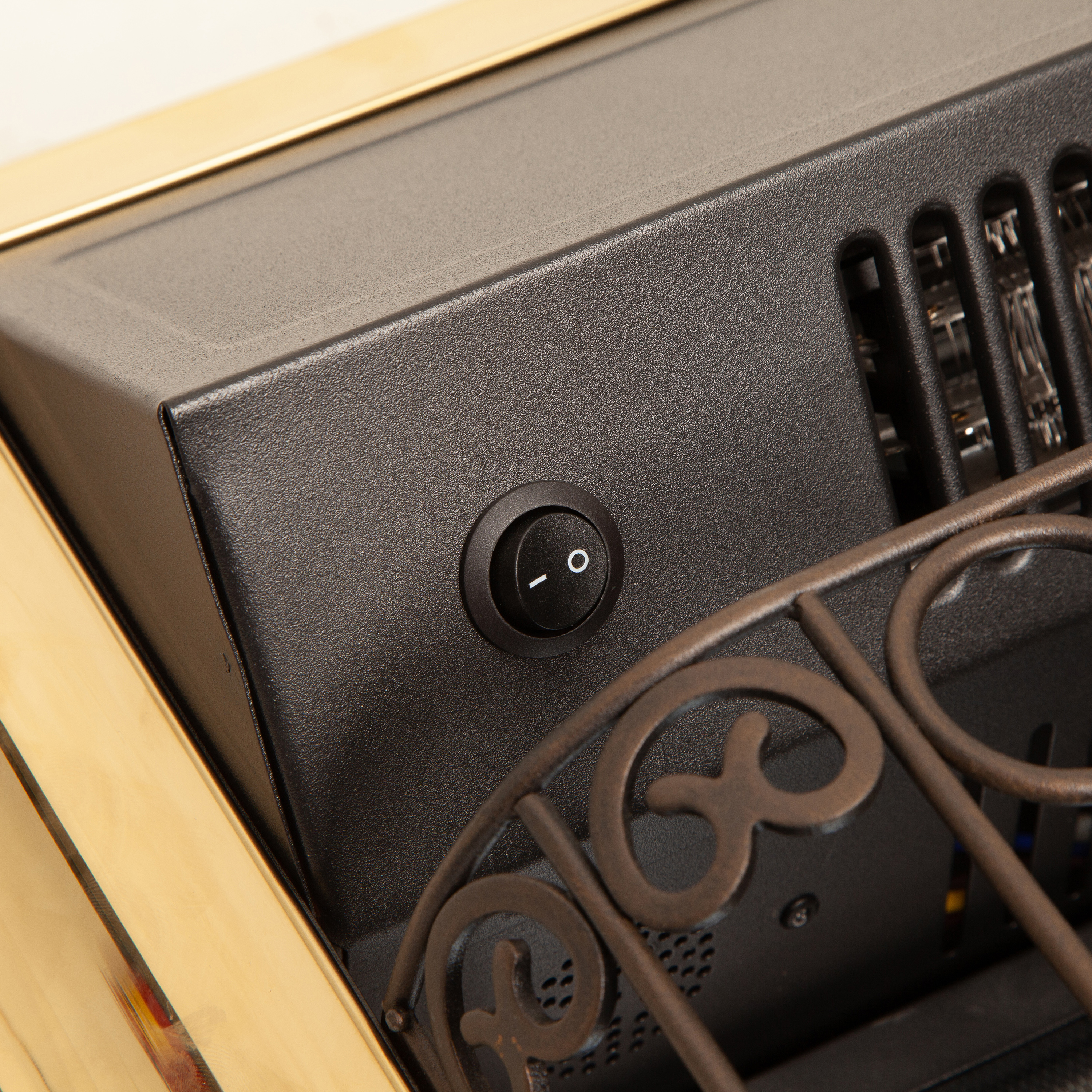 Переключатель позволяет включать на полную (1 500 Вт) или половинную (750 Вт) мощность. В режиме визуализации пламени потребление электроэнергии составляет 80 Вт (две свечеобразные лампы E14 мощностью 40W).