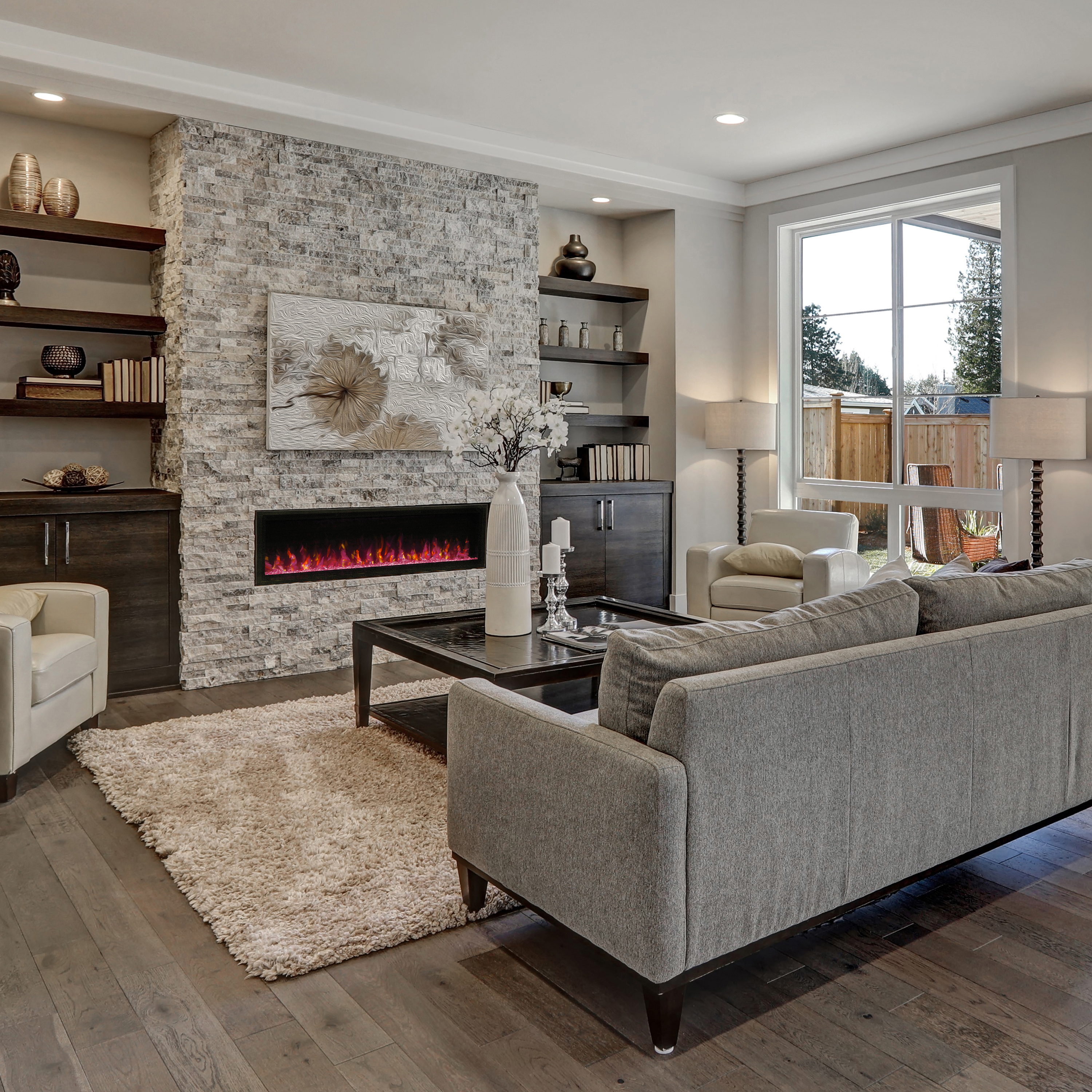 Декоративный очаг RealFlame Saphir 50 - стильный линейный очаг для встраивания в стены и ниши, выполнен в строгом простом стиле с тонкими черными рамами и широким стеклом с диагональю 50 дюймов.